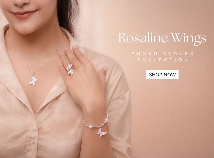 The Rosaline Wings Champagne Bloom Ring is crafted in 925 sterling silver and designed in a delicate four-petal silhouette. Each petal is inlaid with blush and clear sugar stones that catch the light with a gentle, champagne-toned glow.