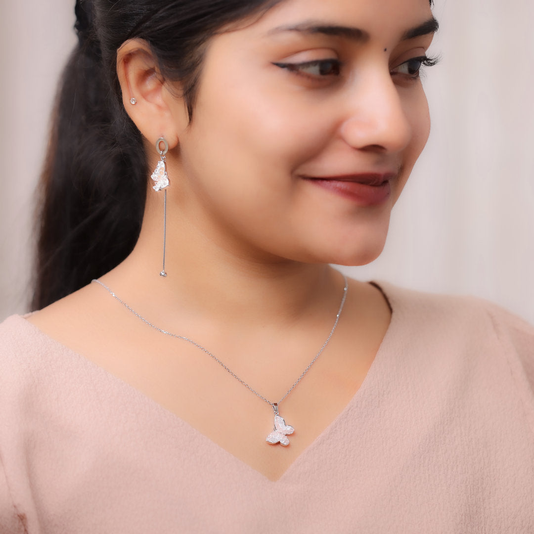 The Rosaline Wings Pendant & Drop Earrings Set is crafted in sterling silver and adorned with blush sugar stones that reflect light with a delicate, petal-like glow. Inspired by the quiet elegance of butterfly wings, each piece is sculpted with a polished silver outline that enhances the translucent pink and clear crystal detailing.