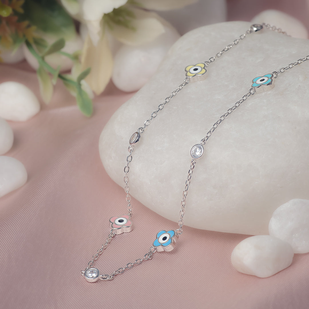 Add a pop of color and a touch of protection to your everyday look with the Vivid Bloom Evil Eye Silver Chain. Handcrafted in 925 sterling silver, this playful chain features vibrant enamel evil eye charms set in delicate flower motifs, accented with bezel-set CZ stones for that extra sparkle.